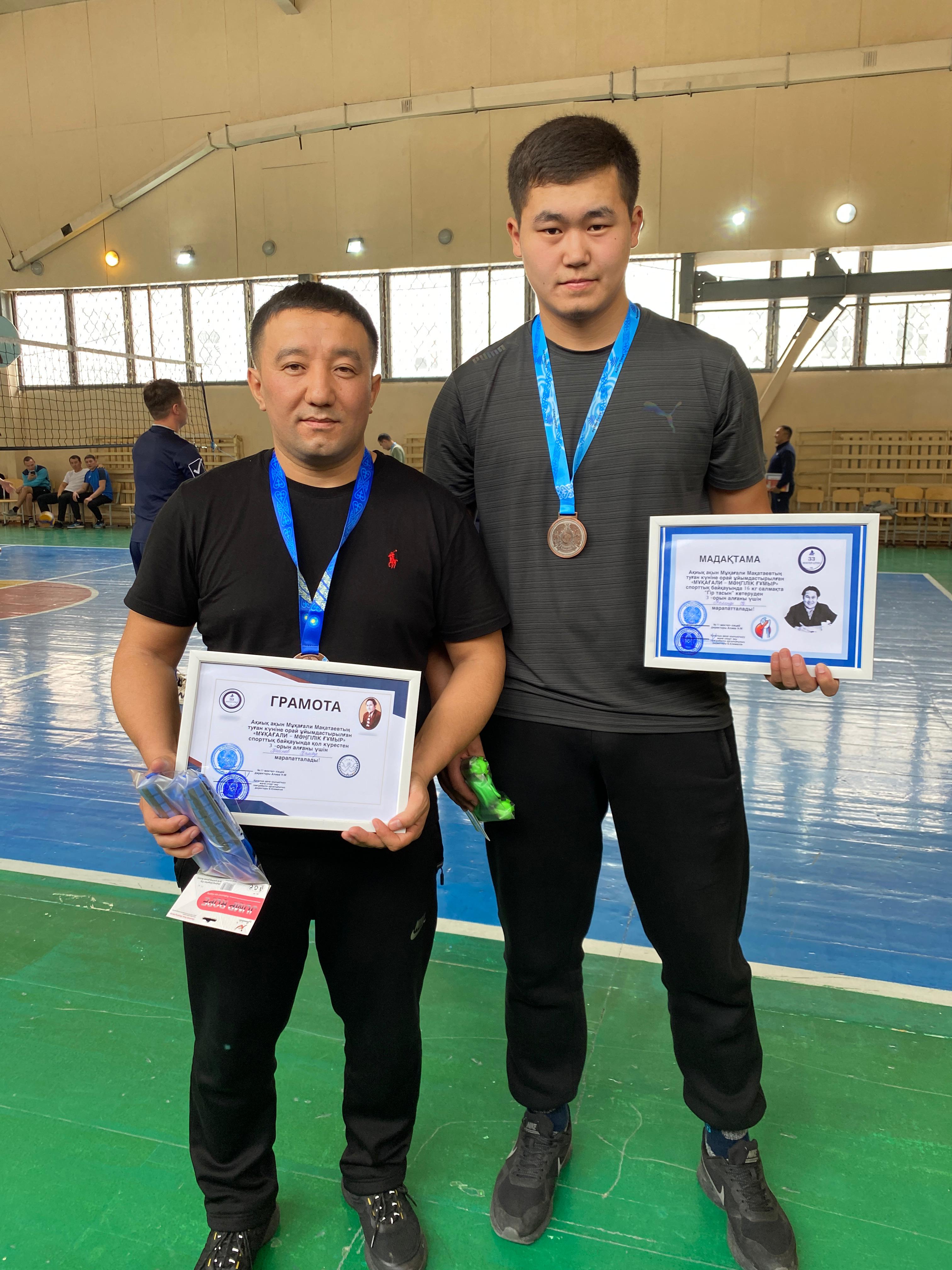 Медеу ауданы бойынша ақиық ақын Мұқағали Мақатаевтың туған күніне орай ұйымдастырылған "МҰҚАҒАЛИ - МӘҢГІЛІК ҒҰМЫР" спорттық байқауында қол күрестен және 16 кг салмақта "Гір тасын" көтеруден 3-орын алғаны үшін мектебіміздің мұғалімдері Касенов Қамбар және Төленді Қанат марапатталды.