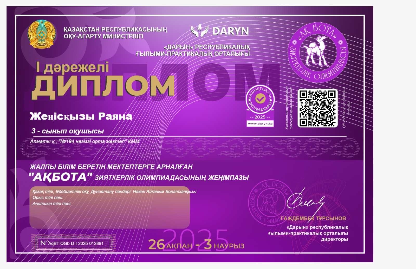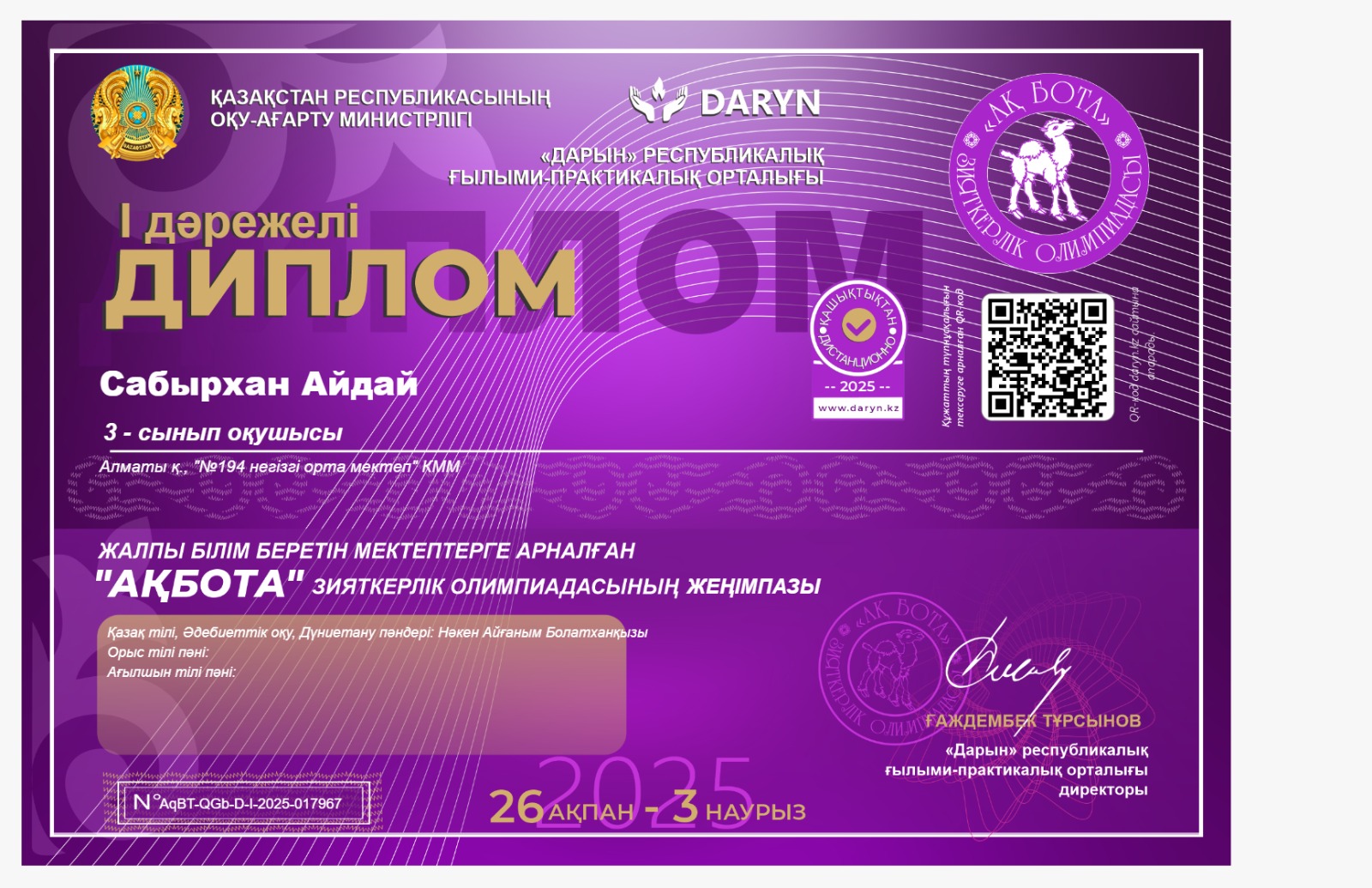 "Ақбота" зияткерлік олимпиадасының жүлдегерлері » КГУ «Общеобразовательная школа №194 » Управления образования г.Алматы