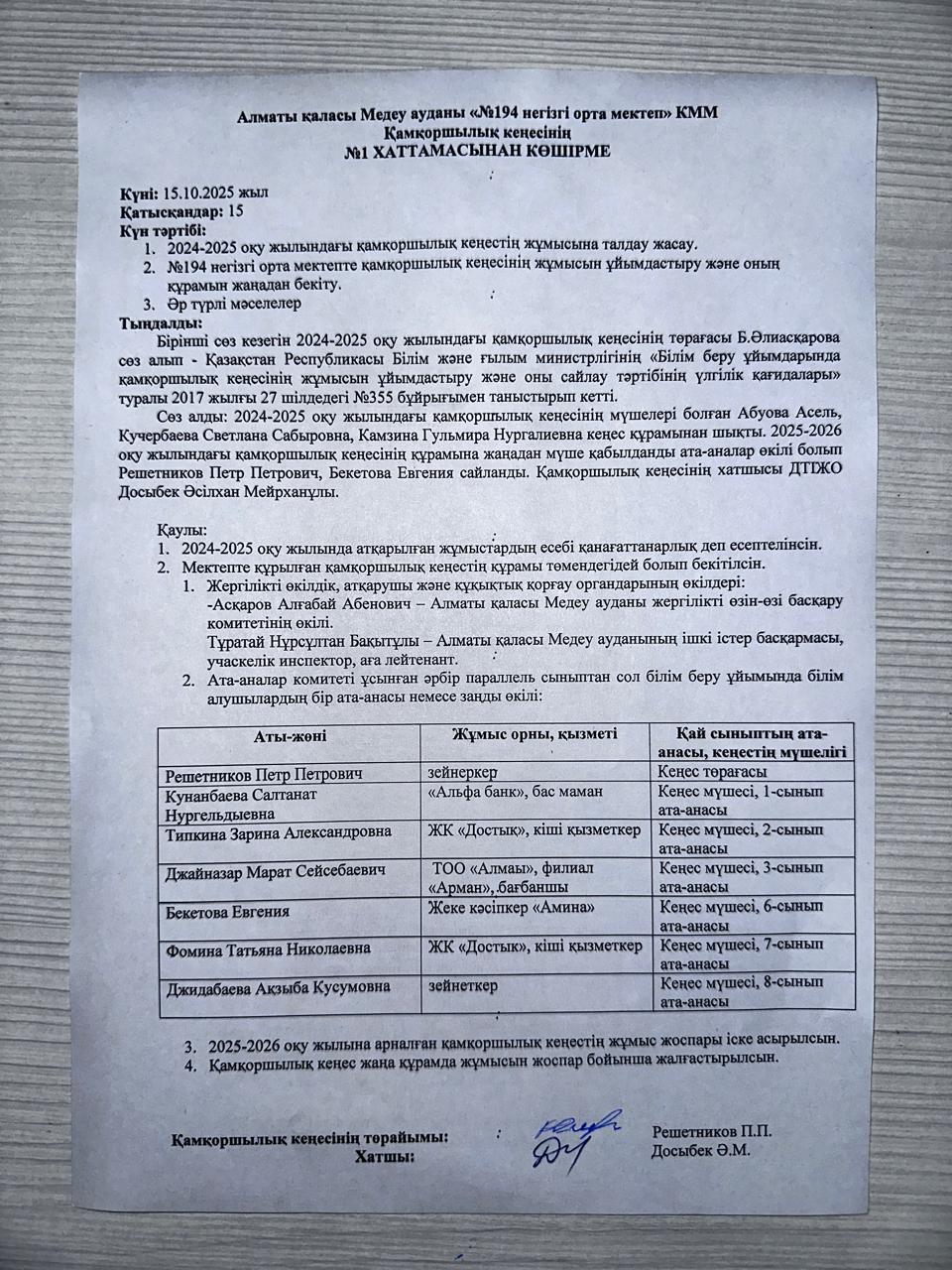2025-2026 оқу жылындағы қамқоршылық кеңесі отырысының №1 хаттамасы » КГУ «Общеобразовательная школа №194 » Управления образования г.Алматы