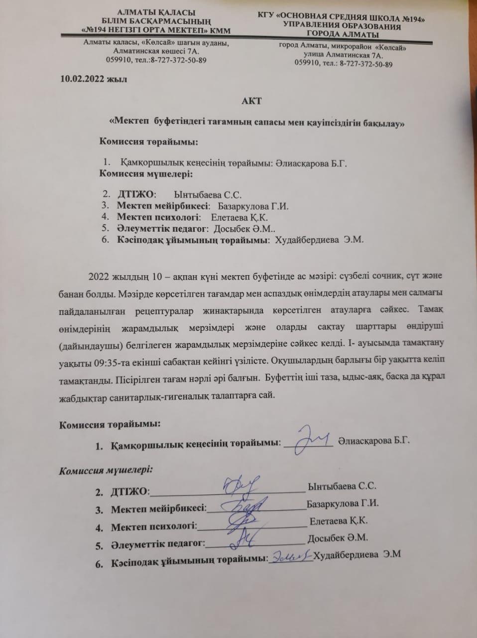 Мектеп буфетіндегі тағамның сапасы мен қауіпсіздігін бақылау » КГУ «Общеобразовательная школа №194 » Управления образования г.Алматы