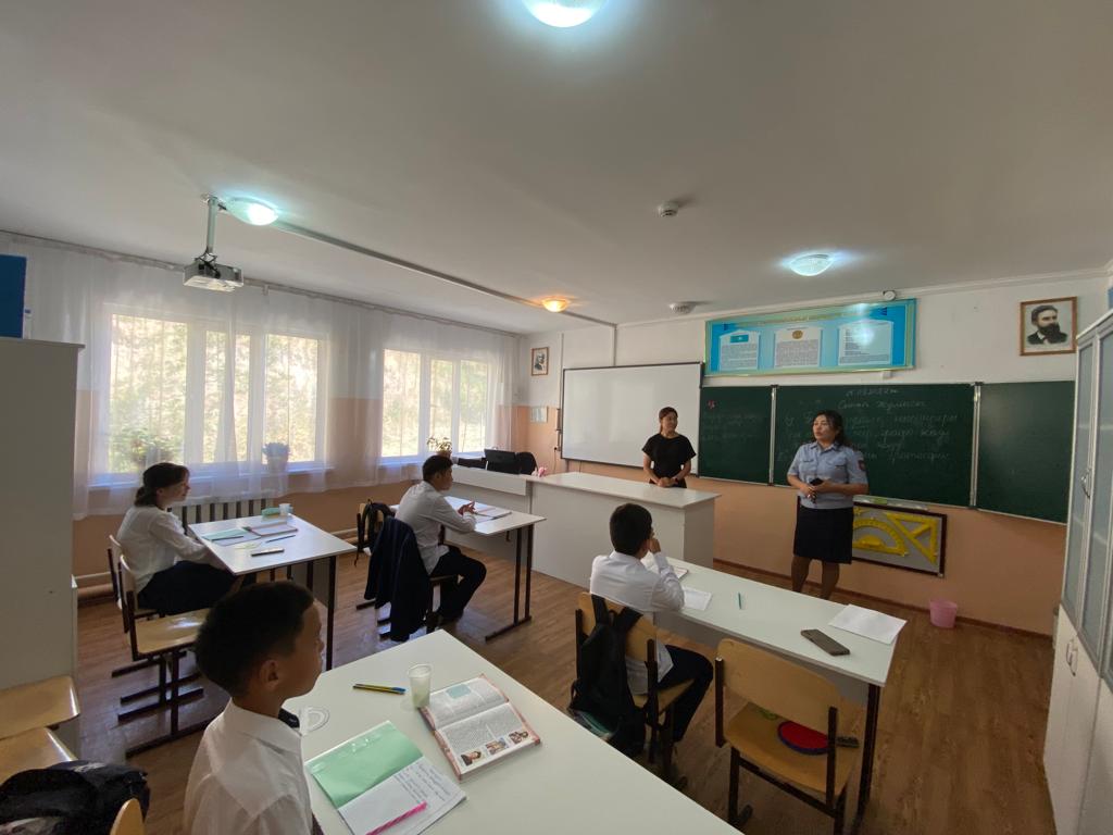 06 сентябрь 2022 0 1 2 3 4 5 Мектеп инспекторымен бірлескен жұмыс Мектеп инспекторы полиция майоры Тулепова Жанна Жанайдаровнамен өткен кездесуде жасөспірімдер арасында құқықбұзушылықтың алдын алу айтылды