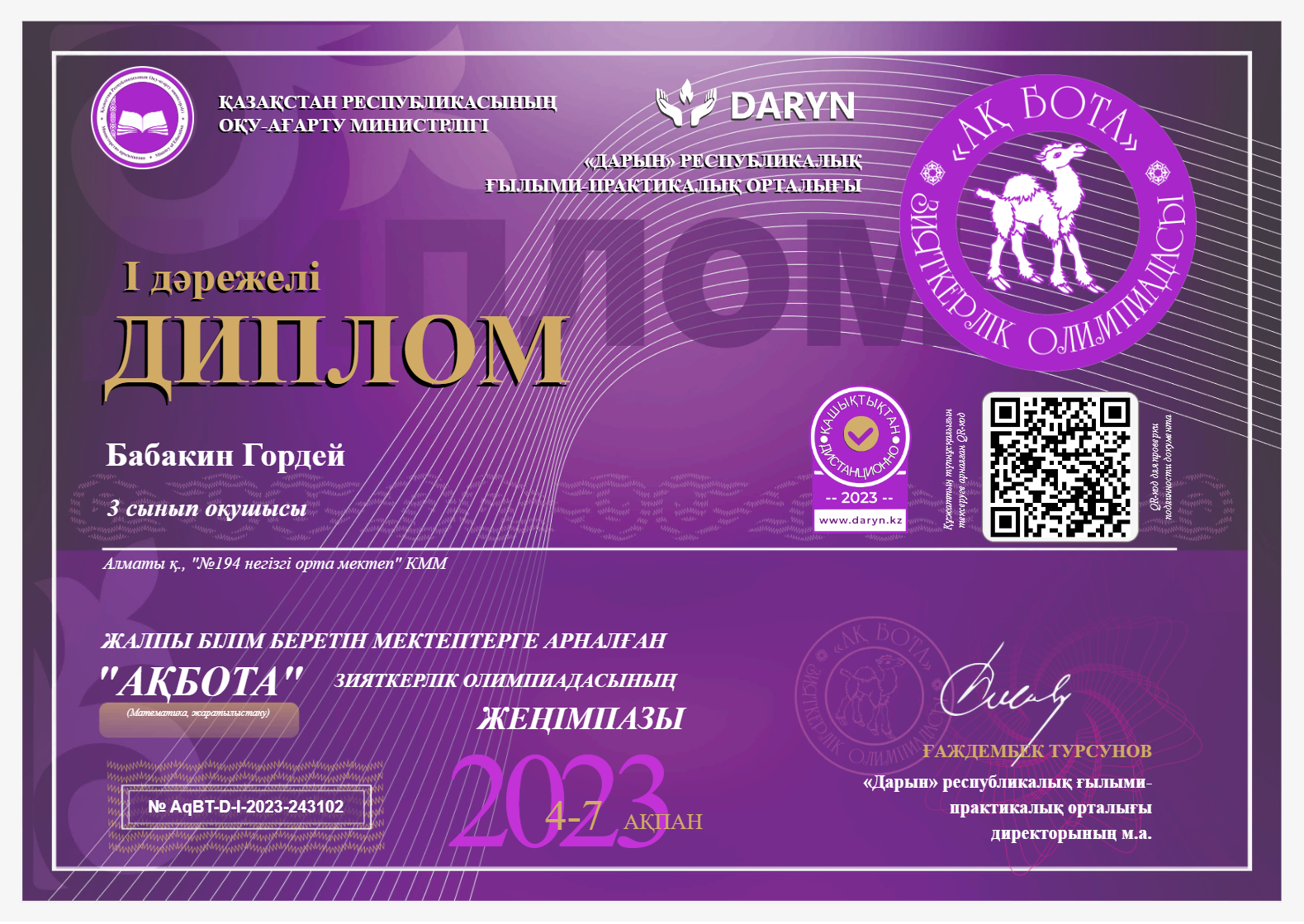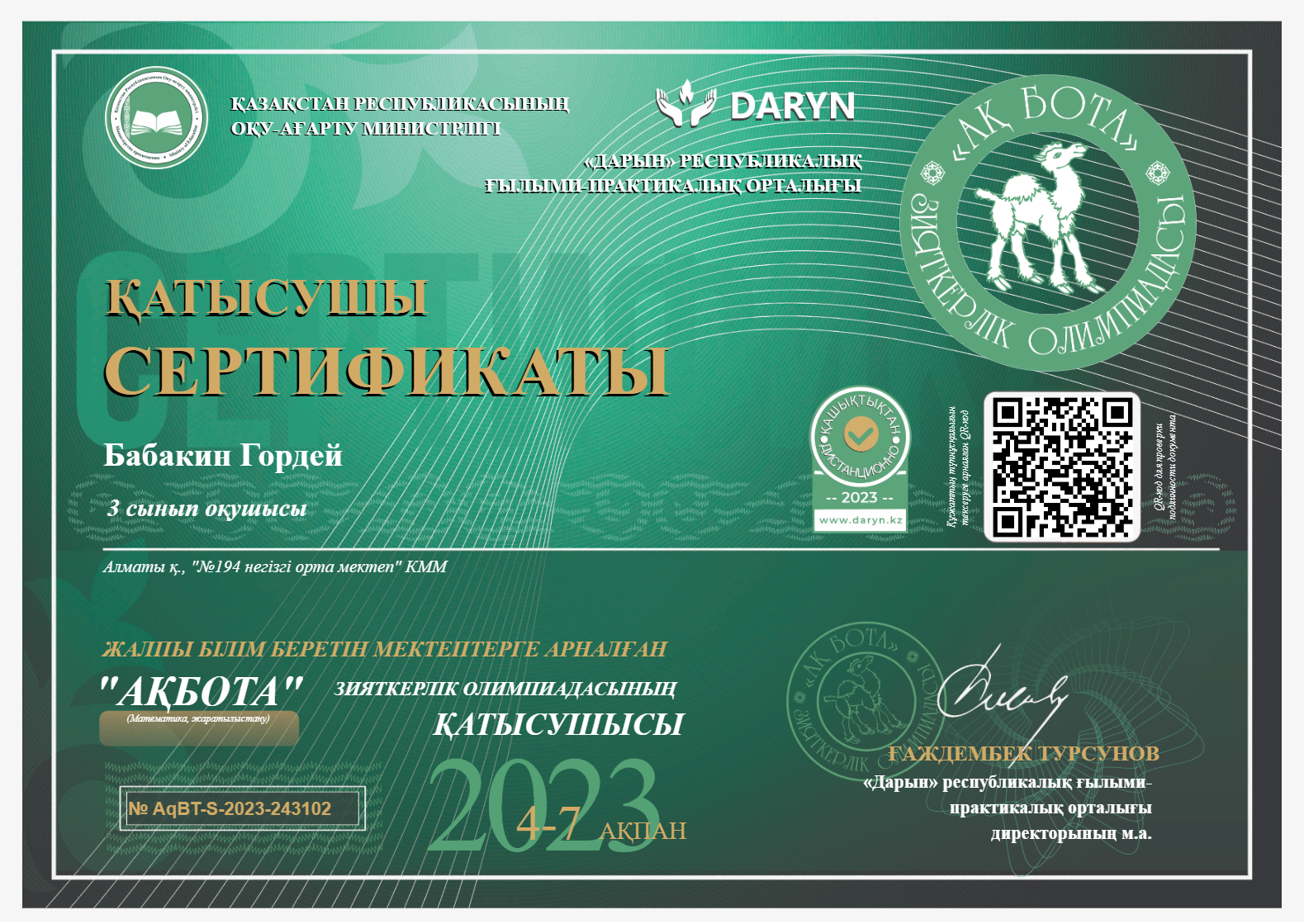"Ақбота" зияткерлік олимпиадасының жеңімпаздары » КГУ «Общеобразовательная школа №194 » Управления образования г.Алматы