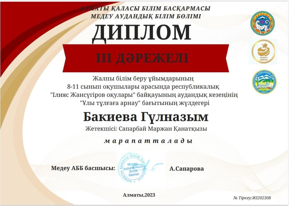 «Ілияс Жансүгіров оқулары» байқауының аудандық кезеңінде «Ұлы тұлғаға арнау» бағыты бойынша ақынға өзіндік суырып салма ақындық ерекше қабілетімен өлеңін арнап, жүлделі 3 орын иеленген 9 сынып білім алушысы Бакиева Гүлназымды құттықтаймыз👏💐 Жетекшісі: Сапарбай Маржан