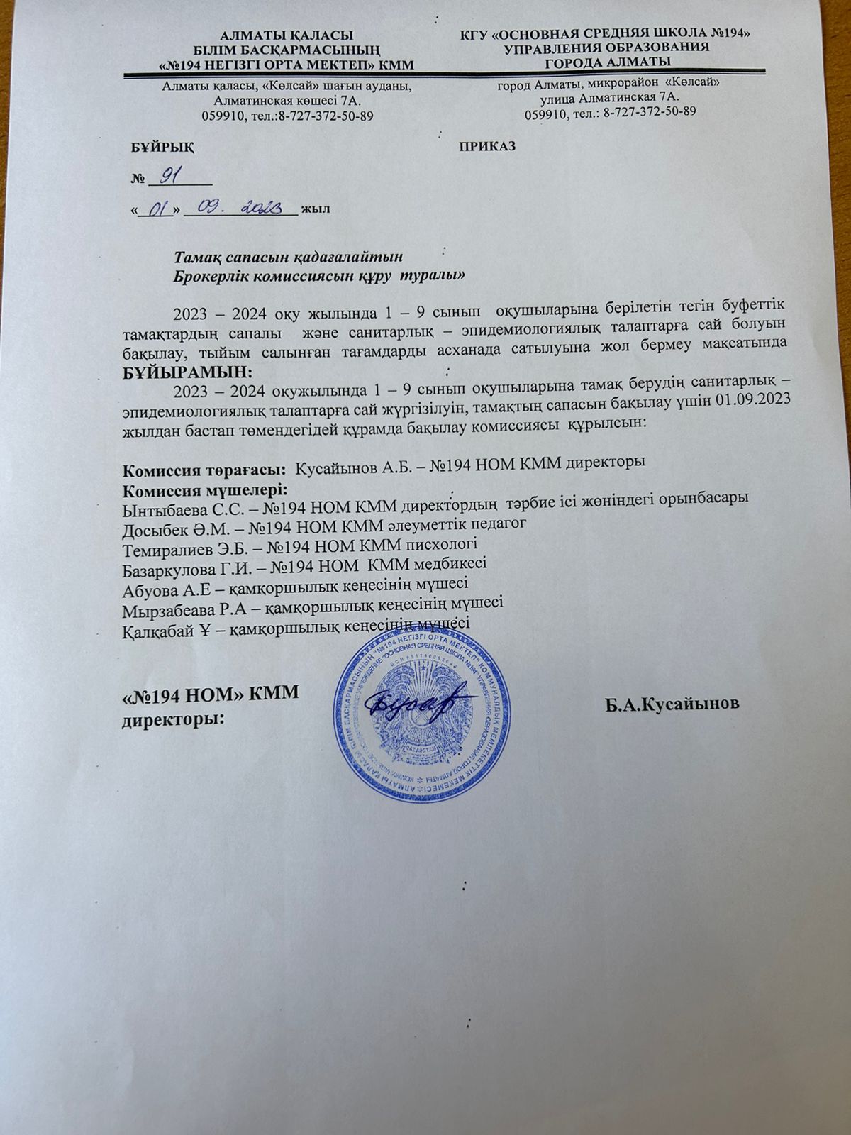 Тамақ сапасын қадағалайтын брокерлік комиссиясын құру туралы бұйрық » КГУ «Общеобразовательная школа №194 » Управления образования г.Алматы
