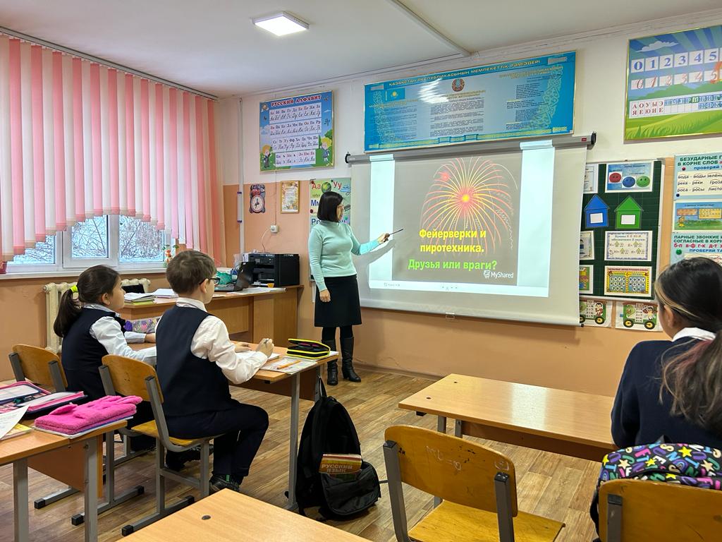- "Қауіпсіз жана жыл» такырыбында интерактивті сабак, откізді. Оқушыларды пиротехникалык