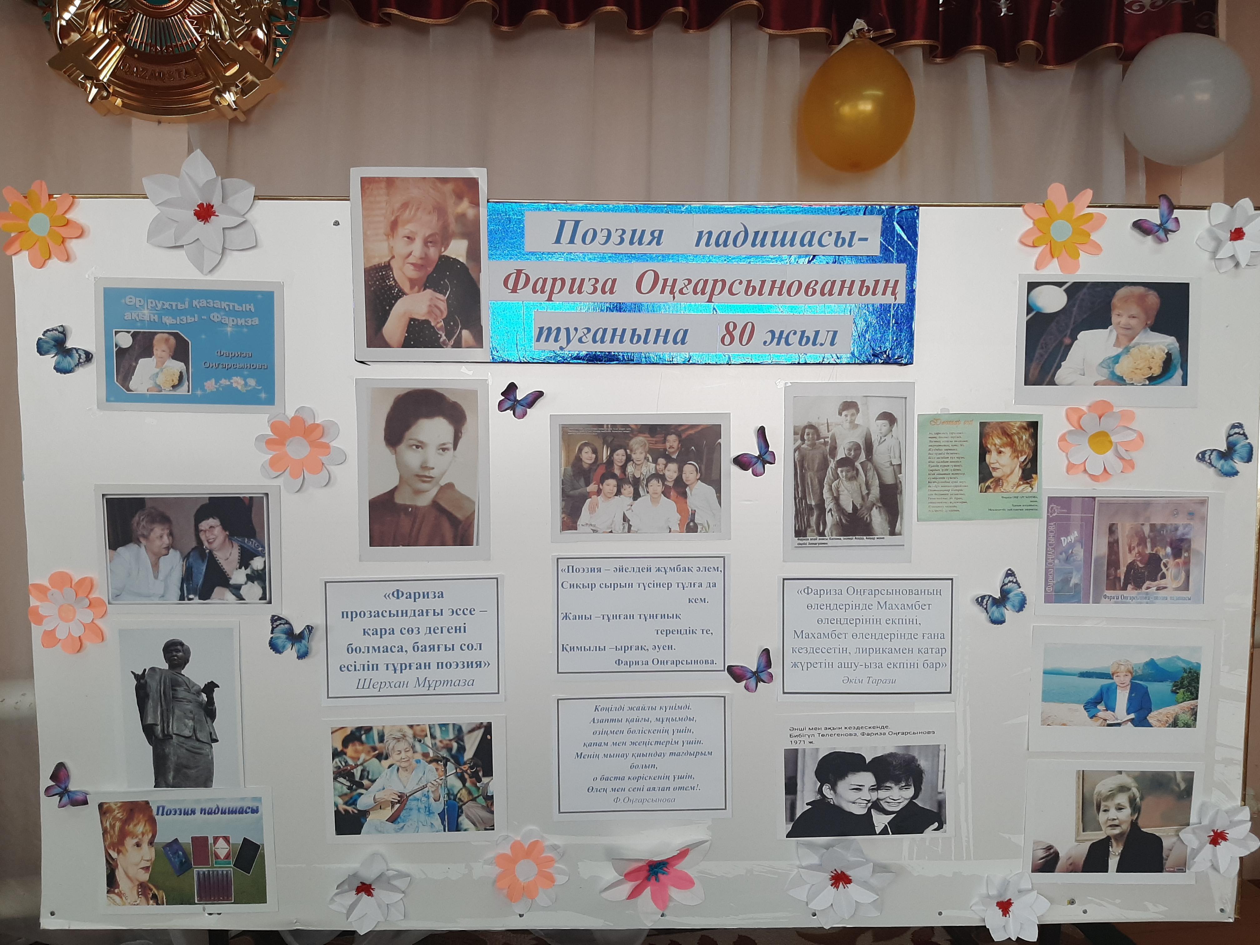 23 январь 2020 0 1 2 3 4 5 Фариза Оңғарсынованың 80-жылдығына арналған кеш Бүгін мектебіміздің қабырғасында Фариза Оңғарсынованың 80-жылдығына орай кеш ұйымдастырылды.