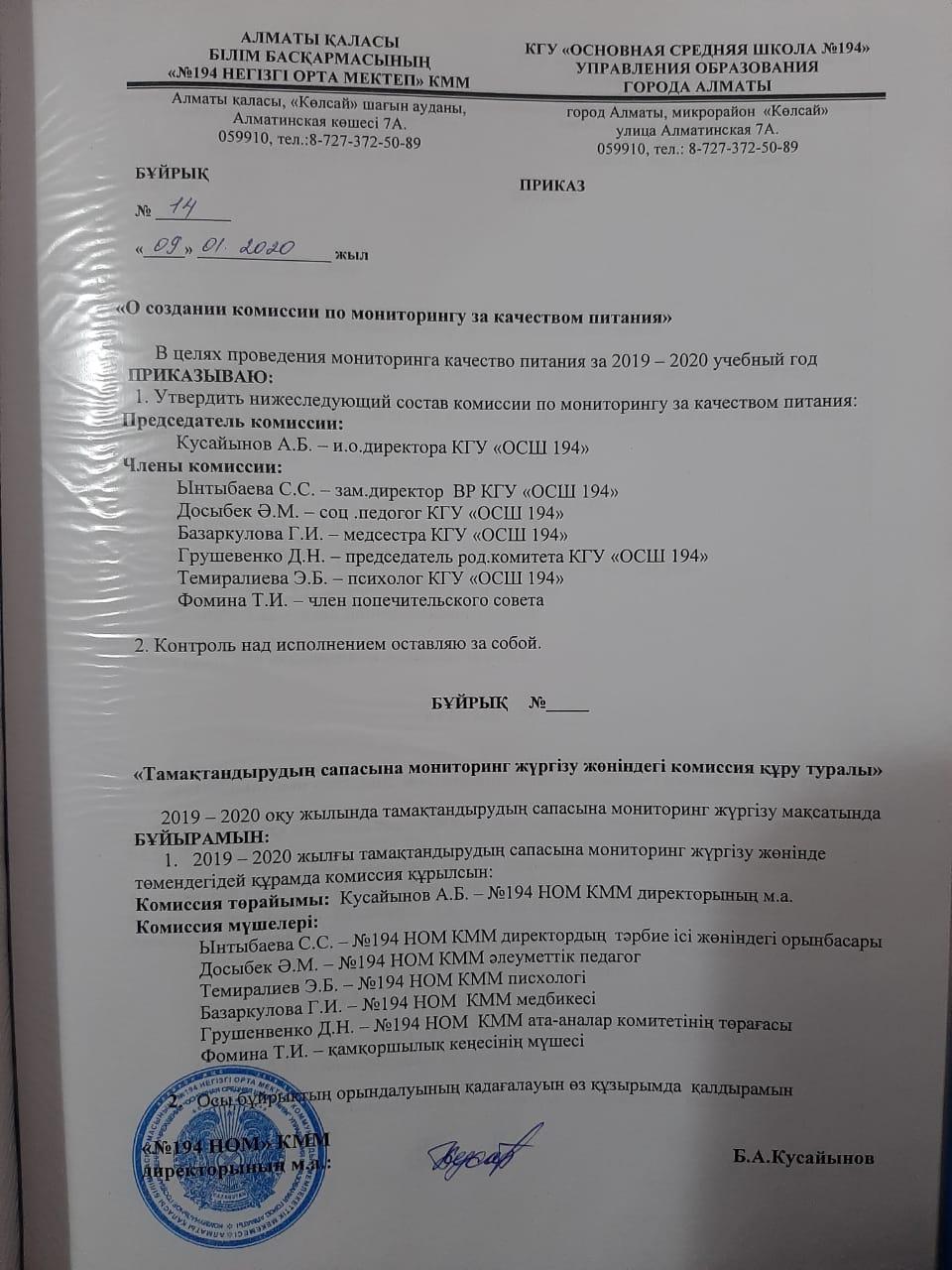 10 январь 2020 0 1 2 3 4 5 Тамақтандыру сапасына мониторинг жүргізу жөніндегі комиссия құру туралы бұйрық