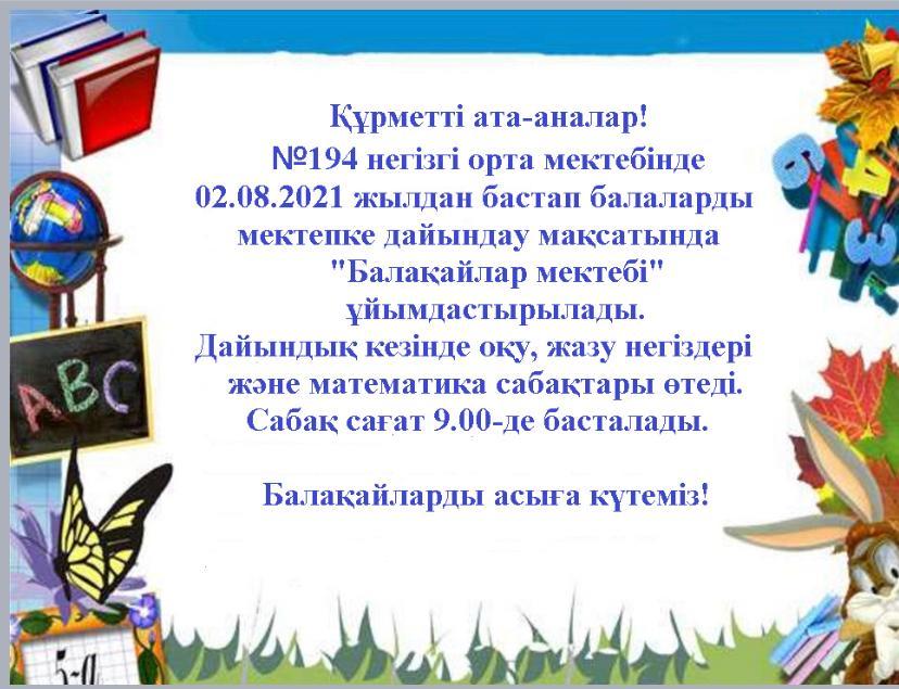 "Балақайлар мектебі" » КГУ «Общеобразовательная школа №194 » Управления образования г.Алматы