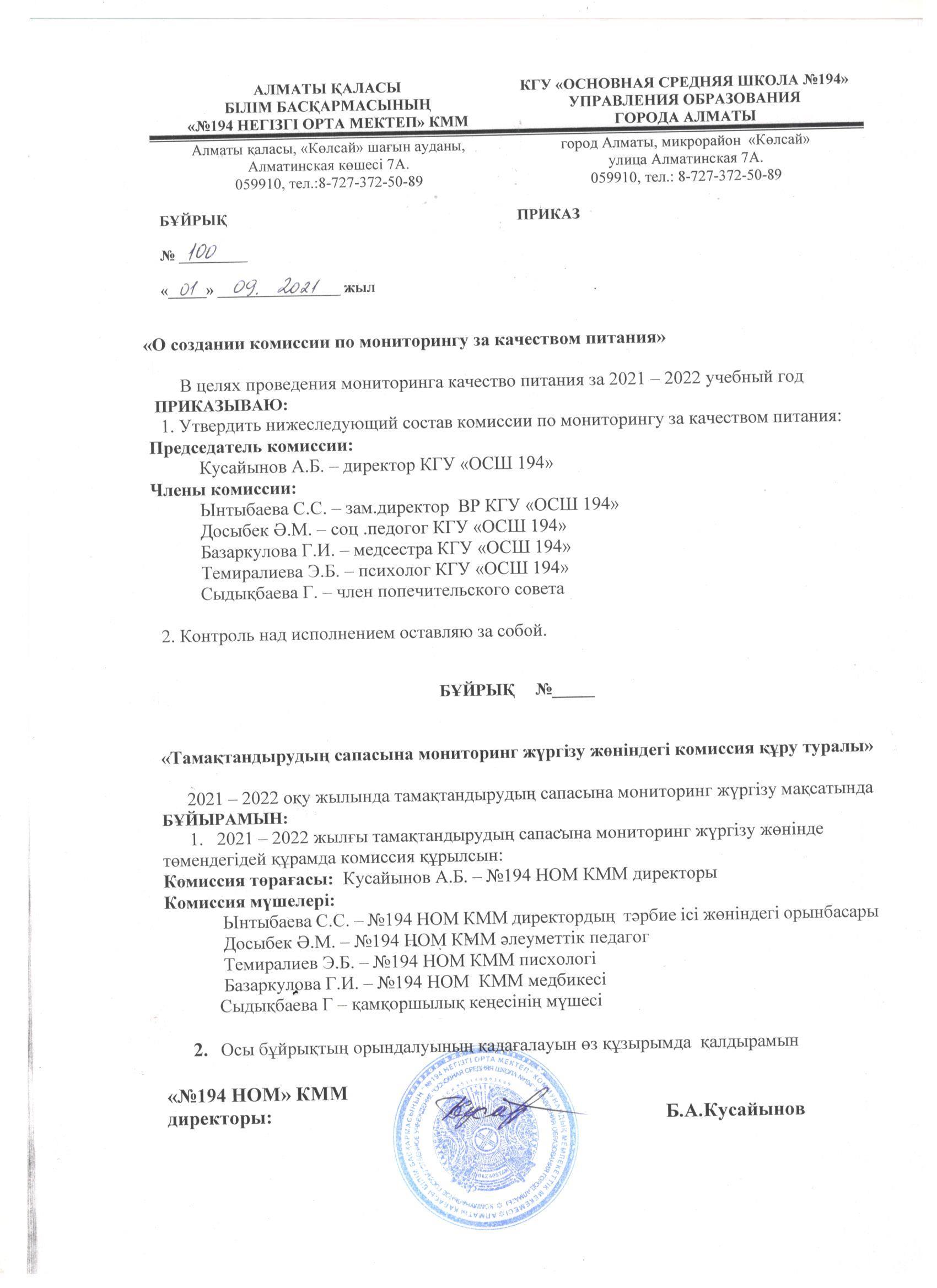 О создании комиссии по мониторингу за качеством питания » КГУ «Общеобразовательная школа №194 » Управления образования г.Алматы