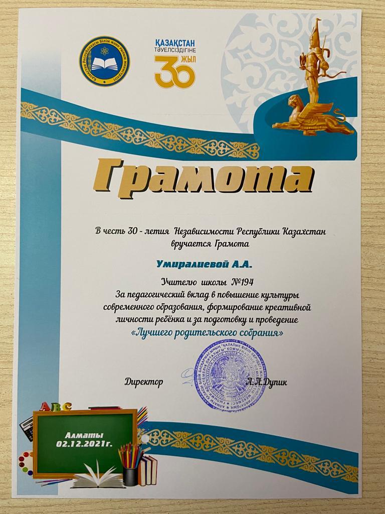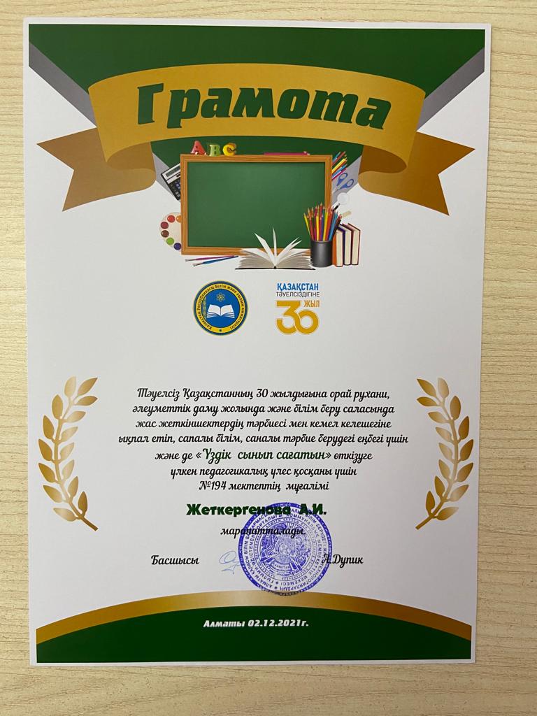 27 декабрь 2021 0 1 2 3 4 5 Сынып жетекшілер жетістігі "Үздік сынып сағаты" және "Үздік ата-аналар жиналысы" номинациясы бойынша бастауыш сынып мұғалімдері Умиралева Айгерім және Жеткергенова Аякөз марапатталды.