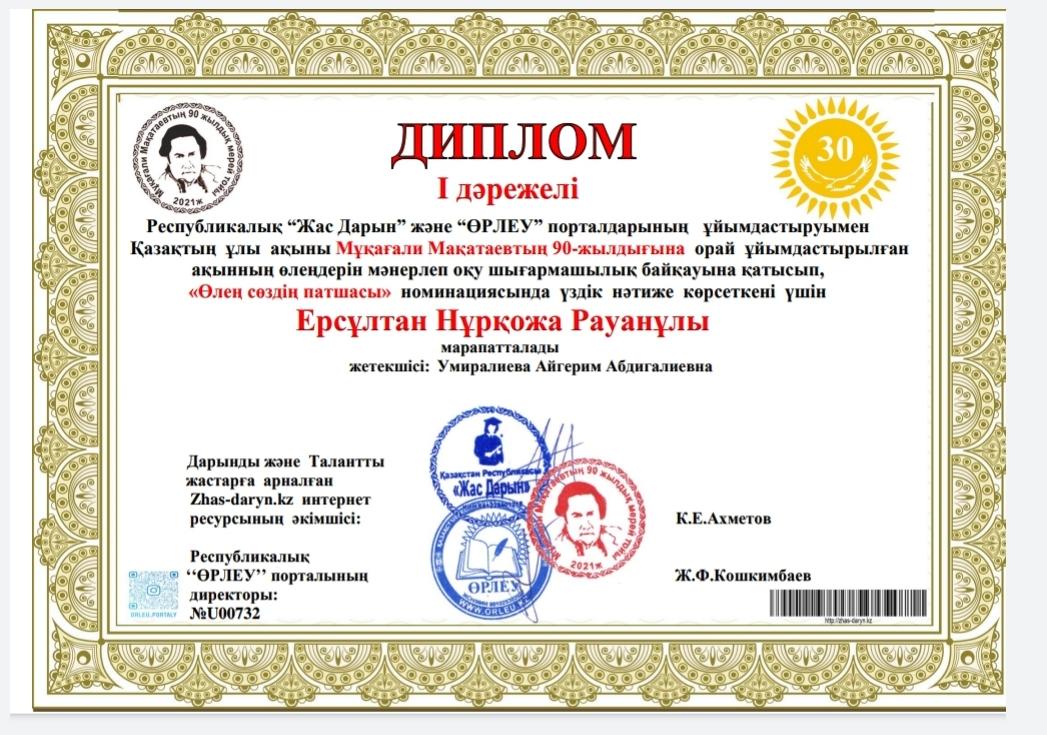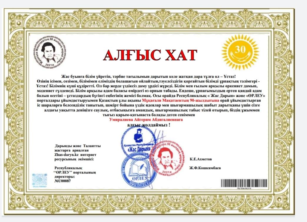 26 февраль 2021 0 1 2 3 4 5 Оқушылардың жетістігі "Жас дарын" және "Өрлеу" порталдары ұйымдастыруымен Қазақтың ұлы ақыны Мұқағали Мақатаевтың 90-жылдығына орай ұйымдастырылған мәнерлеп оқу сайысында белсенділік танытқаны үшін марапатталды