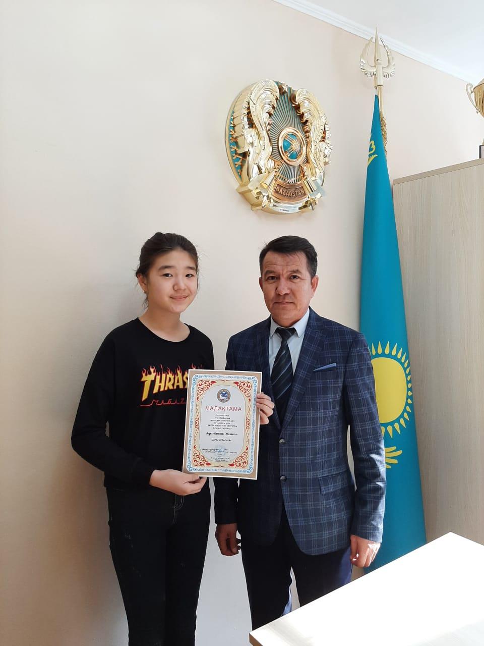 09 апрель 2021 0 1 2 3 4 5 Жетістіктеріміз Мектеп оқушысы Адылбекова Жамиля Медеу аудандық пәндік олимпиадада белсенділік танытқаны үшін марапатталды.