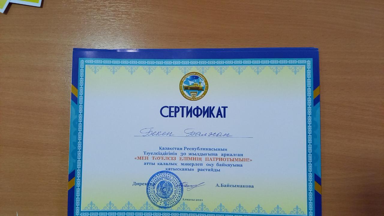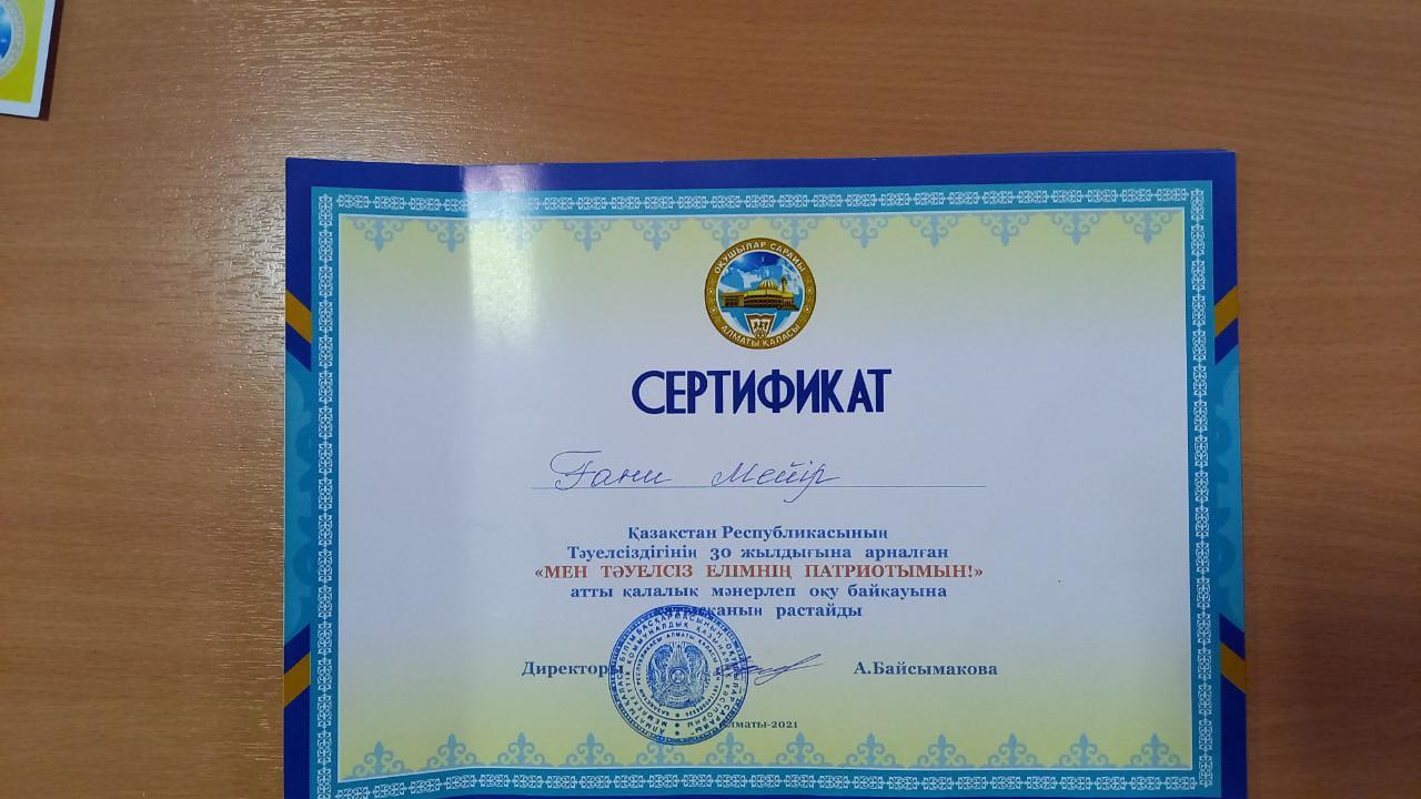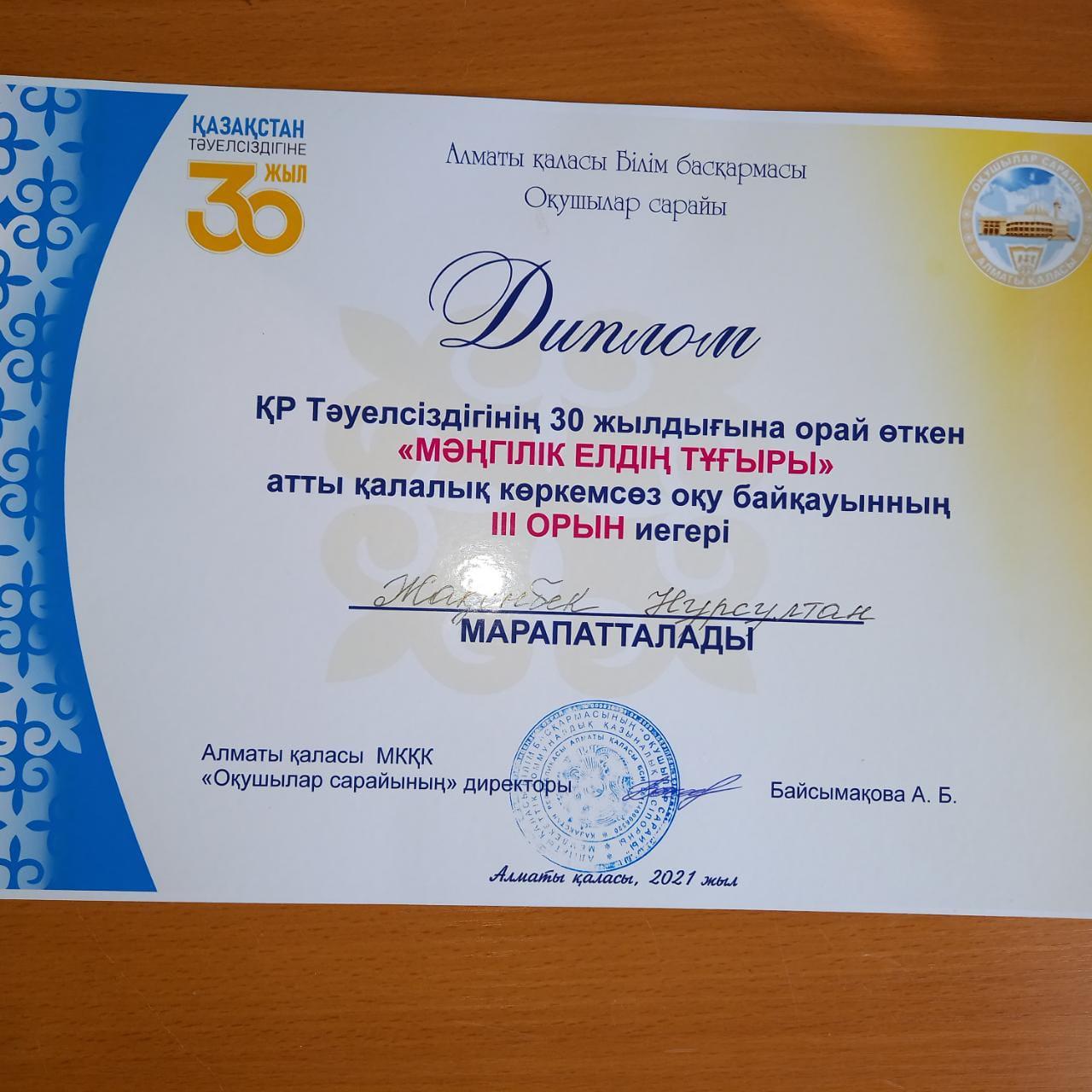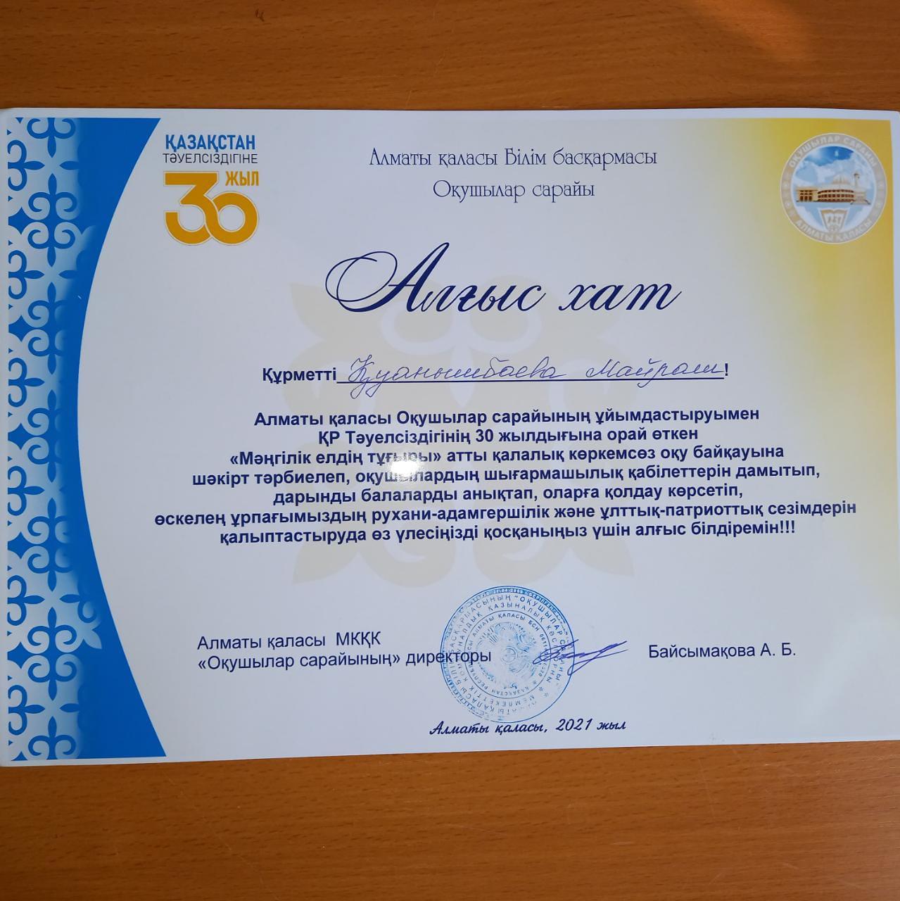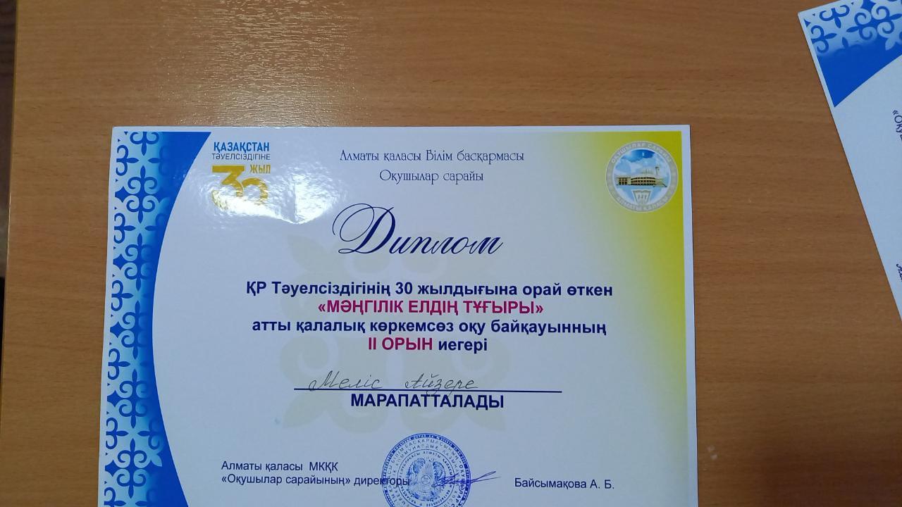 13 декабрь 2021 0 1 2 3 4 5 Жетістіктеріміз Мектебіміздің білім алушылары оқушылар сарайында Тәуелсіздігіміздің 30 жылдығына орай ұйымдастырылған байқауда жүлделі орындарға ие болды