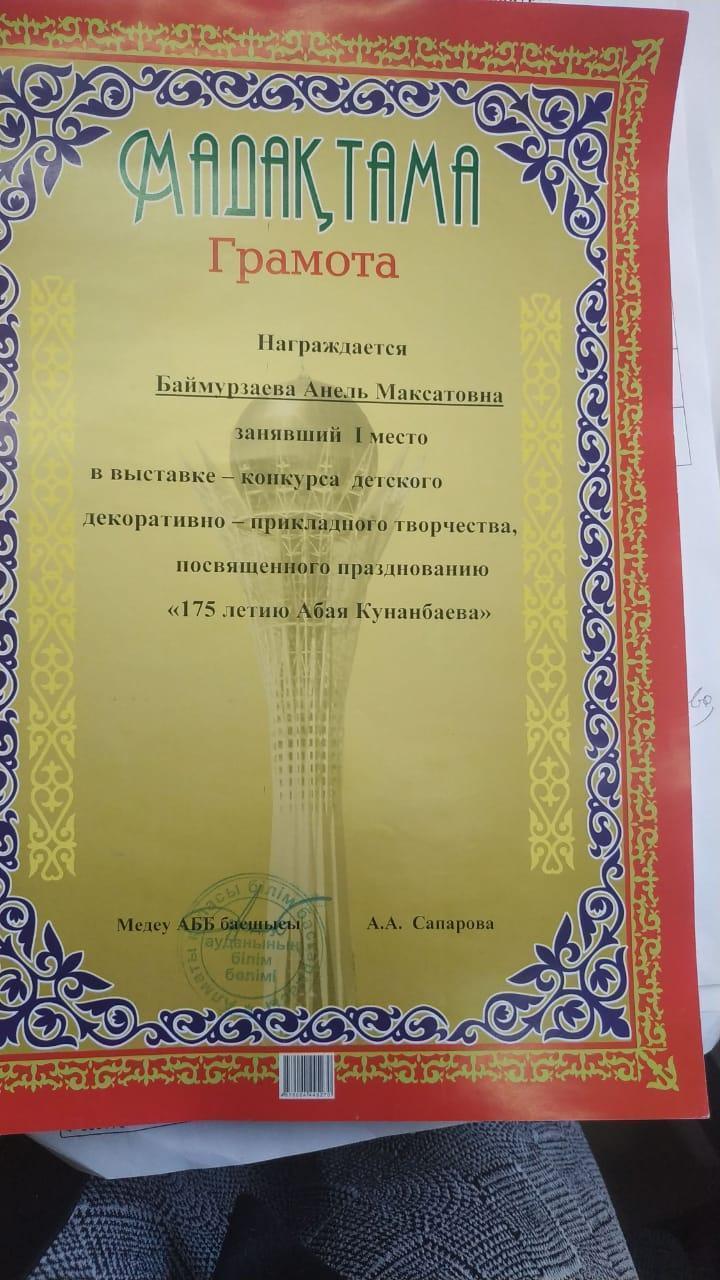 04 ноябрь 2019 0 1 2 3 4 5 Ұлы ақын Абай Құнанбайұлының 175-жылдық мерей тойына орай ұйымдастырылған сайыстан жүлдеміз Мектебіміздің білім алушысы Баймурзаева Анель ұлы ақын Абай Құнанбайұлының 175-жылдық мерей тойына арналған аудандық қолөнер сайысында І орын иеленді