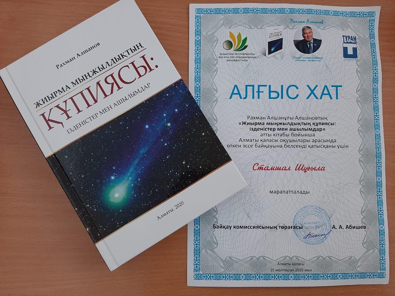 18 январь 2021 0 1 2 3 4 5 Жетістіктеріміз Рахман Алшанұлы Алшановтың "Жиырма мыңжылдықтың құпиясы: ізденістер мен ашылымдар" атты кітабы бойынша Алматы қаласы оқушылары арасында өткен эссе байқауына белсенді қатысқаны үшін Стамшал Шұғыла марапатталды