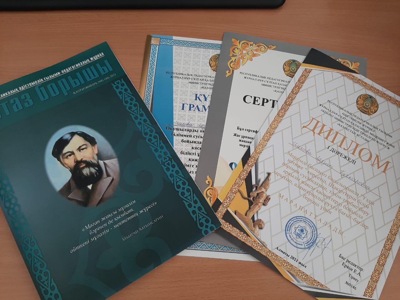 Мектептің математика пәні мұғалімі ИльясоваЛаззат Кучкаровна жас ұрпаққа жаңаша білім беру жолында оқу-тәрбие үдерісін жандандырудың, патриоттық тәрбие берудің әдістерін мерзімді баспасөз бетіне жариялау арқылы көрсеткені үшін марапатталды.