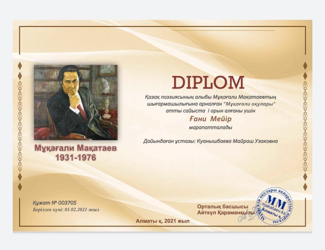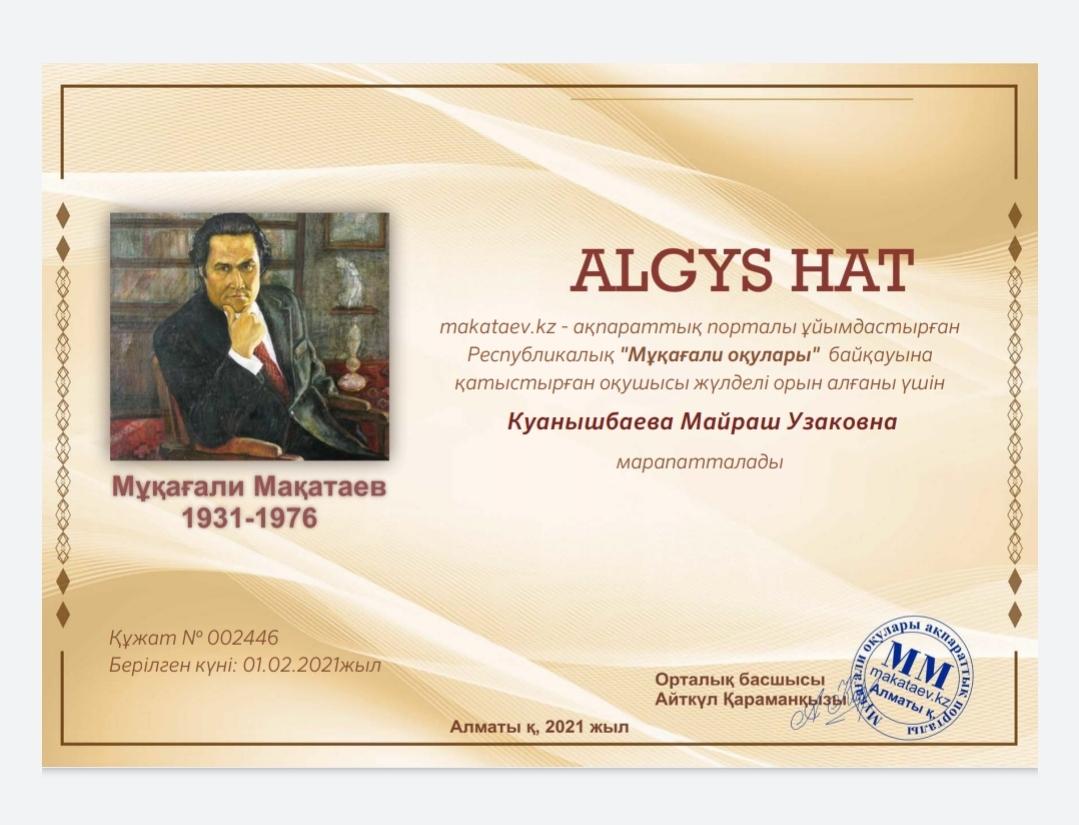 05 февраль 2021 0 1 2 3 4 5 Жетістіктеріміз makataev.kz - ақпараттық порталы ұйымдастырған Республикалық "Мұқағали оқулары" байқауына қатысып мектеп оқушысы Ғани Мира дипломмен марапатталды. Жетекшісі Куанышбаева Майраш Узаковна