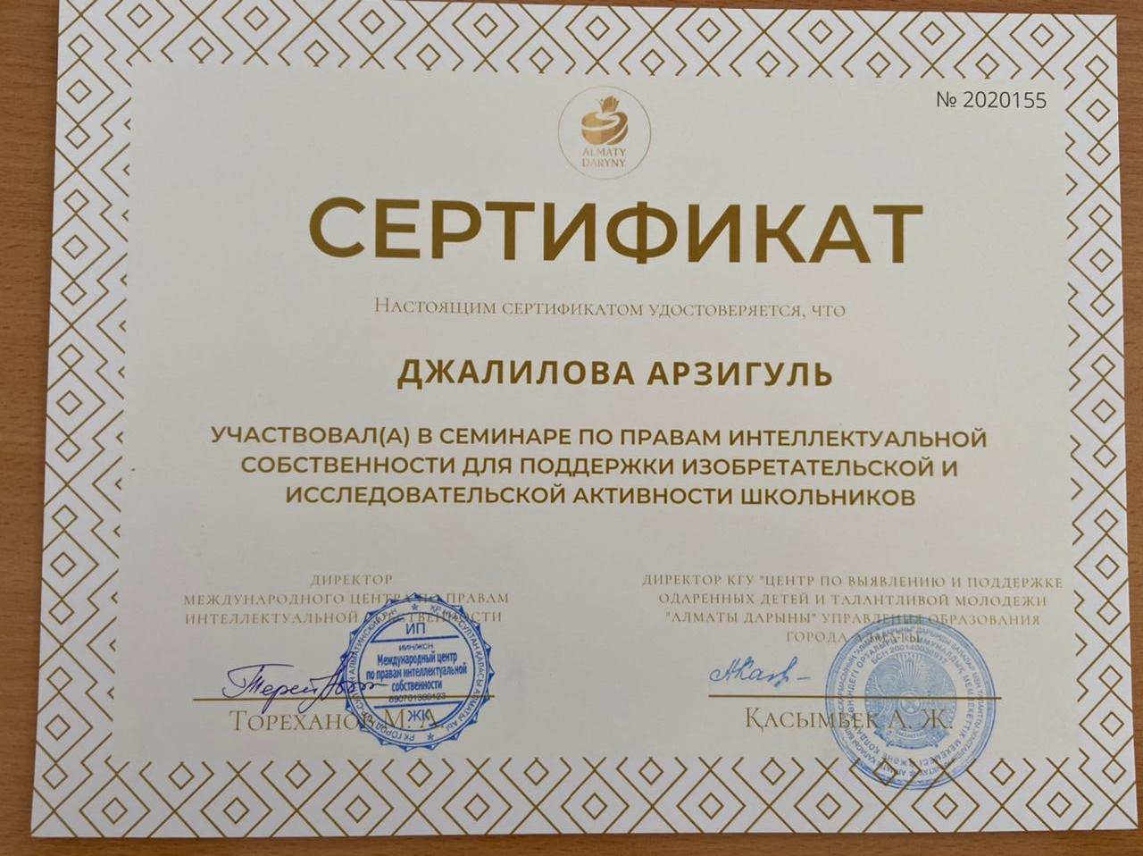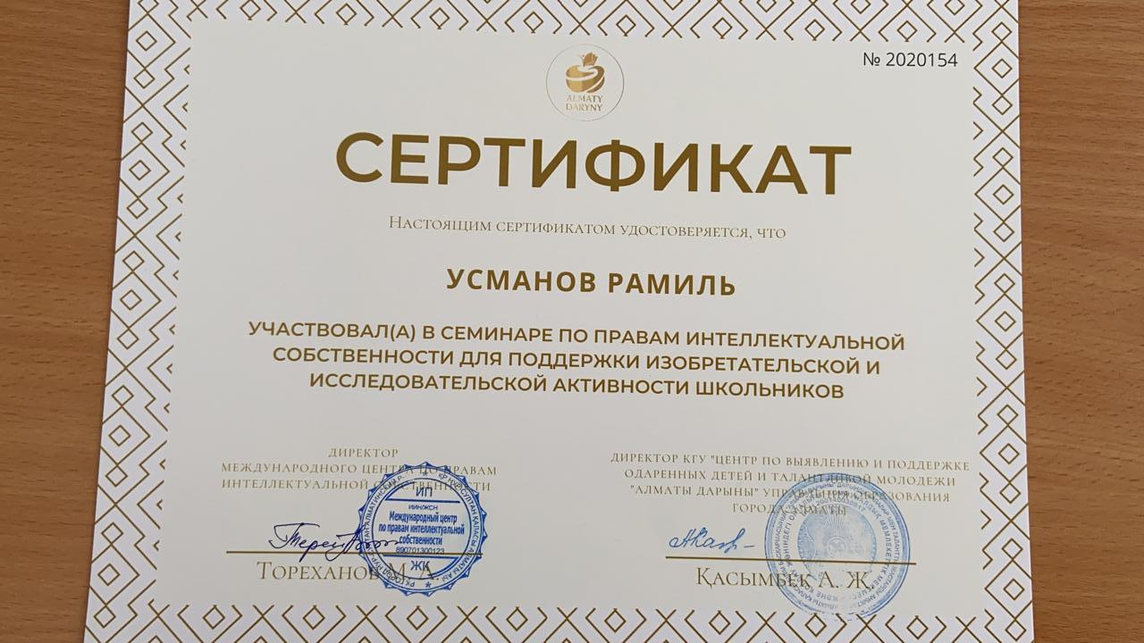 08 февраль 2021 0 1 2 3 4 5 Жетістіктеріміз Ученики Основной средней школы №194 получили сертификаты за участие в семинаре по правам интеллектуальной собственности для поддержки изобретательской и исследовательской активности школьников