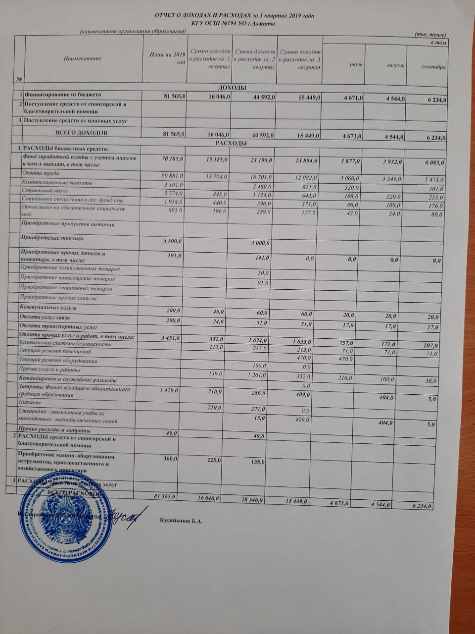 2019 жылдың 3 тоқсанының (квартал) кіріс шығыс есебі » КГУ «Общеобразовательная школа №194 » Управления образования г.Алматы