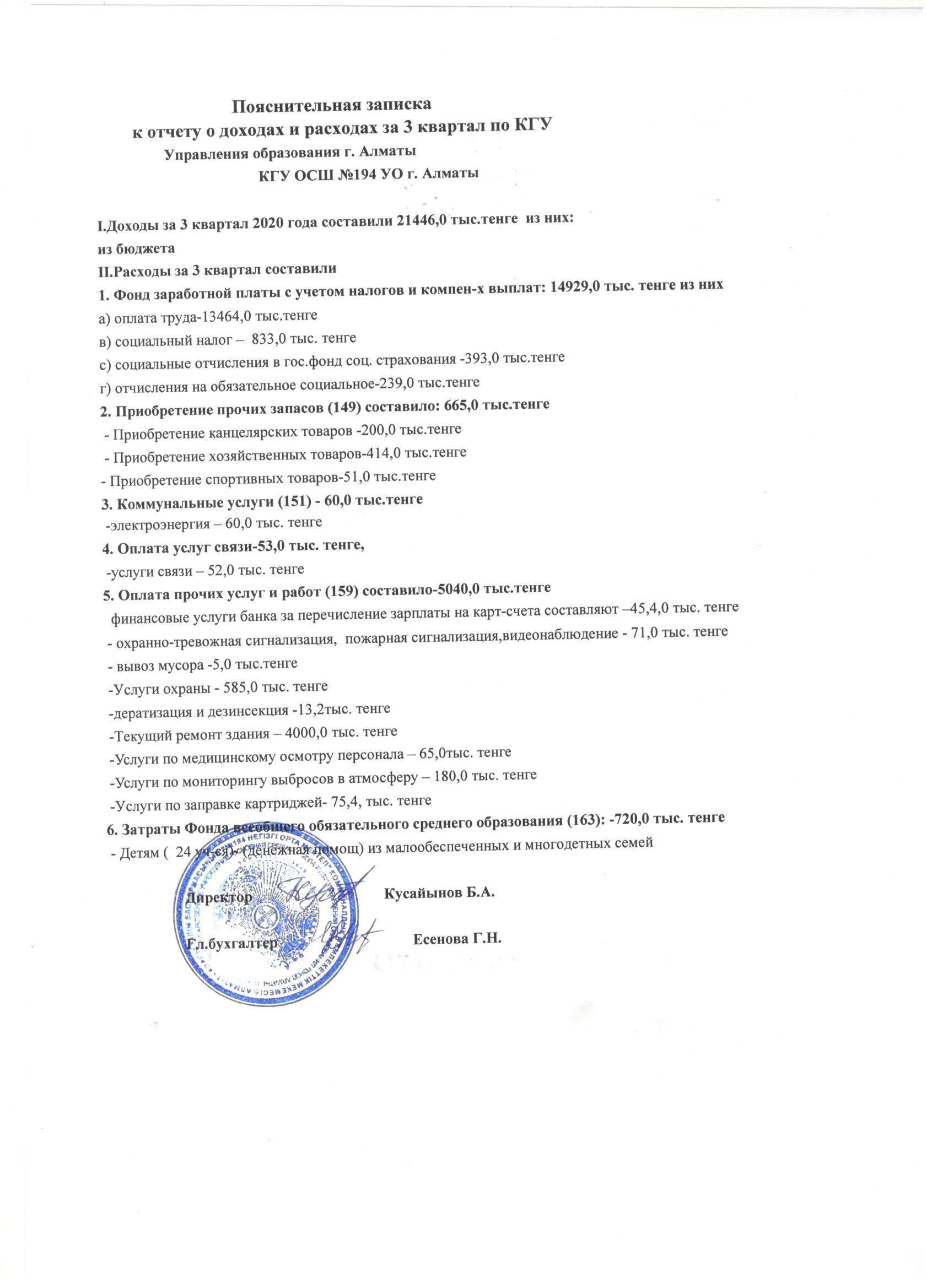 Кіріс шығыс есебі 2020 жыл 3 квартал » КГУ «Общеобразовательная школа №194 » Управления образования г.Алматы