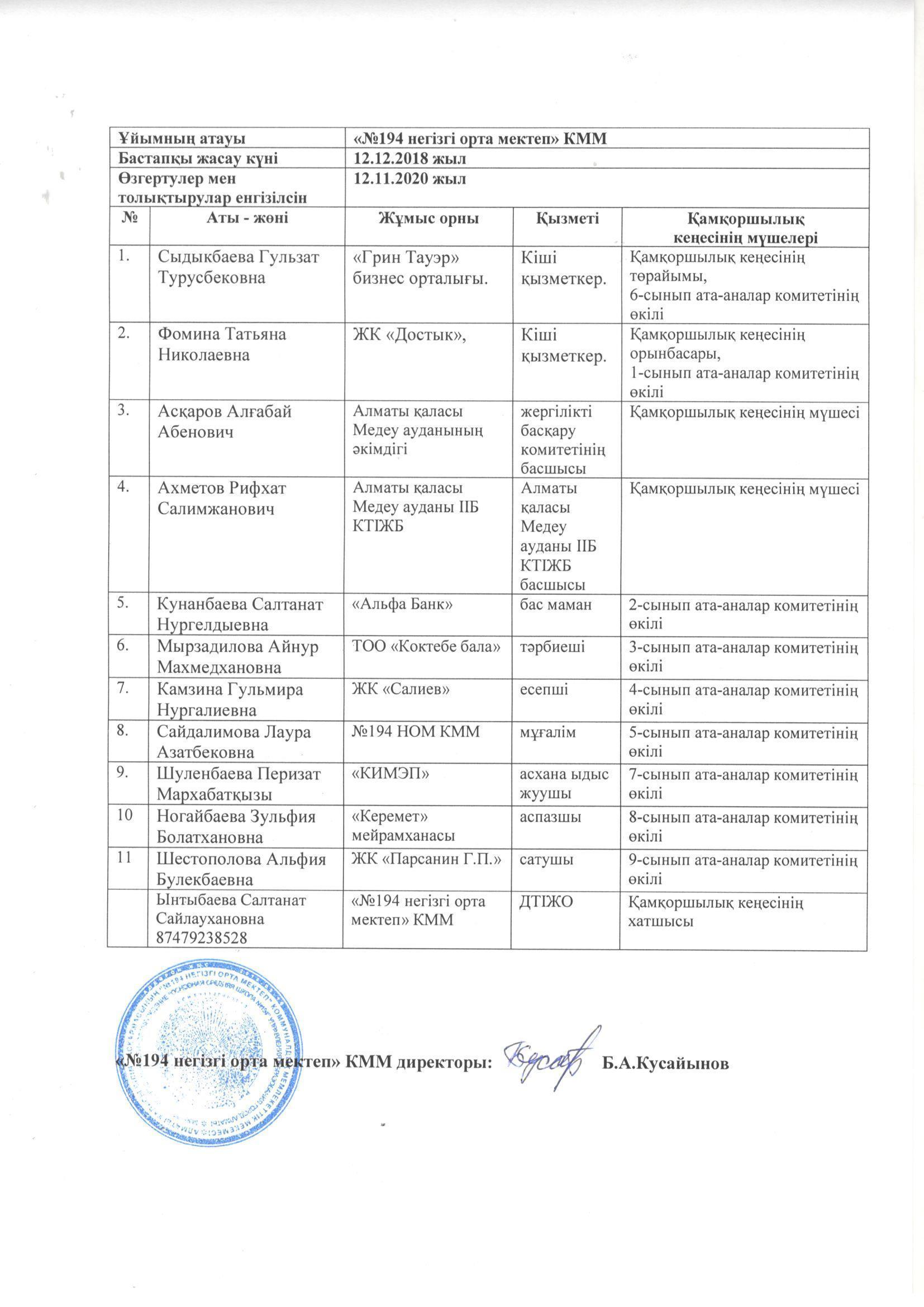 Қамқоршылық кеңес мүшелері » КГУ «Общеобразовательная школа №194 » Управления образования г.Алматы